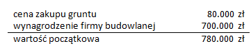 Przykład B:Podatnik wybudował dom o powierzchni 98,5 m2, korzystając częściowo z usług firmy budowlanej, a część prac wykonał we własnym zakresie. Wynagrodzenie firmy budowlanej, które obejmowało również zakup niezbędnych do budowy materiałów, wyniosło w sumie 700.000 zł. Podatnik nabył działkę pod budowę za wartość 80.000 zł. Dodatkowo wypłacił współmałżonce wynagrodzenie w wysokości 10.000 zł za wykonanie drobniejszych prac. Wartość osobiście wykonanych przez podatnika prac wyniosła 25.000 zł. Wartość początkowa wybudowanego domu wynosi zatem: