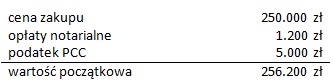 Przykład A:Podatnik zakupił nieruchomość o powierzchni 52,6 m2 za cenę 250.000 zł. Notariusz pobrał opłaty w wysokości 6.200 zł, w tym 5.000 zł podatku od czynności cywilnoprawnych. Wartość początkowa lokalu wynosi zatem: