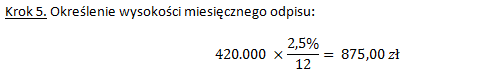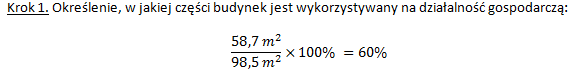 Przykład. Podatnik jest właścicielem budynku o całkowitej powierzchni równej 98,5 m2, który częściowo (58,7 m2) wykorzystuje na cele działalności gospodarczej. Wartość początkowa całego budynku została ustalona przez Podatnika jako 700.000 zł. Podatnik wpłaca miesięczne zaliczki na podatek dochodowy.