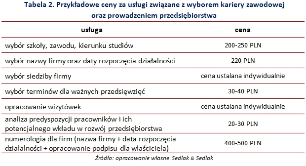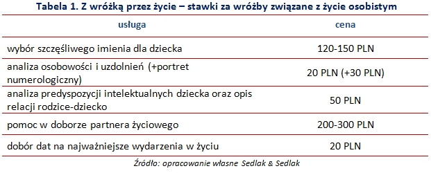 Bogactwo oferowanych przez wróżbitów usług może objąć niemal całe życie człowieka, począwszy od jego narodzin. Wiele osób profesjonalnie zajmujących się przepowiadaniem przyszłości i doradztwem życiowym oferuje przyszłym rodzicom dobór szczęśliwego imienia dla ich potomka. Za tego typu usługi wróżbici inkasują od 120 PLN do 150 PLN. Ponadto oferują oni przeprowadzenie analizy osobowości i uzdolnień dziecka. Koszt tej usługi to około 20 PLN, gdy do tego „dorzucić” stworzenie portretu numerologicznego, cena wzrasta do 50 PLN. Wśród jakże bogatego wachlarza możliwości wróżbitów znajduje się również opis predyspozycji intelektualnych dziecka oraz opis relacji rodzice-dziecko. Wróżbici zajmują się także pomocą w doborze życiowego partnera. Koszt tej usługi zależy od tego, jak bardzo rozbudowana ma być analiza. Za pomoc w wybraniu odpowiedniej osoby na męża/żonę wróżka życzy sobie od 200 PLN do 300 PLN. Za dodatkowe 20 PLN może ona również wskazać daty, na które powinniśmy zaplanować najważniejsze w naszym życiu wydarzenia.
