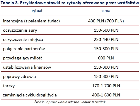 Wróżbici oferują także przeprowadzanie rytuałów. Najdroższym z nich jest rytuał tarczy. Jak sama nazwa wskazuje, polega on na zbudowaniu swojego rodzaju tarczy energetycznej, która ma za zadanie chronić człowieka przed negatywnymi wydarzeniami. Cena tego ceremoniału uzależniona jest od liczby powtórzeń, które trzeba wykonać. Koszt pojedynczego cyklu wynosi 170 PLN, maksymalnie można przeprowadzić 10 cykli, co daje łącznie 1 700 PLN. Nieco tańszy jest rytuał zamknięcia cyklu drogi życia, który polega na odcięciu się od wszystkich negatywnych wydarzeń i rozpoczęcia życia „na nowo”. Cały rytuał obejmuje 4 cykle, przy czym cena jednego wynosi 400 PLN.