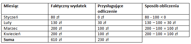 Pan Jan w styczniu 2017 r. wydał na leki kwotę w wysokości 80 zł, następnie w lutym 130 zł, a w marcu i kwietniu po 200 zł, to w rocznym rozliczeniu PIT może odliczyć kwotę 230 zł, czyli sumę kwot obliczanych jako nadwyżkę wydatków poniesionych w danym miesiącu, a kwotą 100 zł.