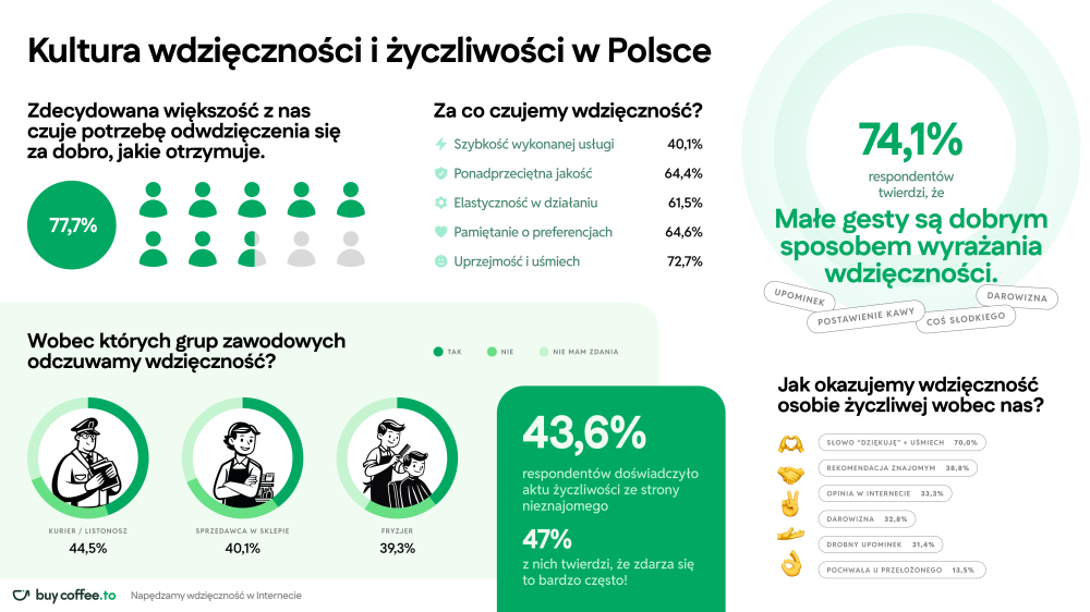 Potrzeba okazywania wdzięczności w Polsce jest dziś wyjątkowo silna – a wśród osób, którym najchętniej dziękujemy, zdecydowanie dominują kurierzy i pracownicy usług. To główny wniosek z badania Fundacji Instytutu Badań Rynkowych i Społecznych (IBRiS) przeprowadzonego na zlecenie buycoffee.to.