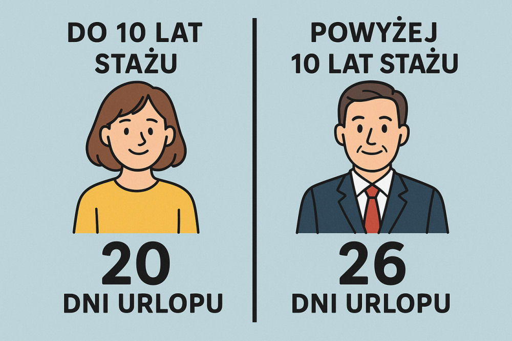 Długość urlopu wypoczynkowego zależy od stażu pracy pracownika. Pracownikowi przysługuje 20 dni urlopu rocznie, jeśli jest zatrudniony krócej niż 10 lat, oraz 26 dni, jeśli jest zatrudniony co najmniej 10 lat.