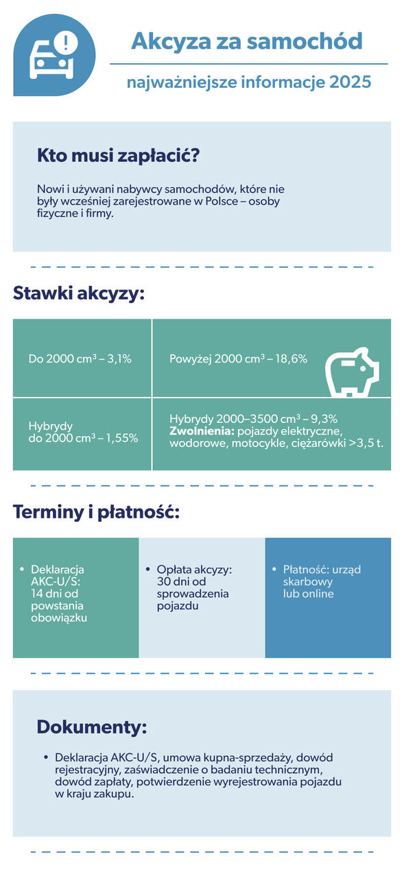 - Gdzie zapłacić akcyzę za auto? Podatek akcyzowy należy uiścić w ciągu 30 dni od sprowadzenia pojazdu do Polski, można to zrobić osobiście w urzędzie skarbowym lub online.